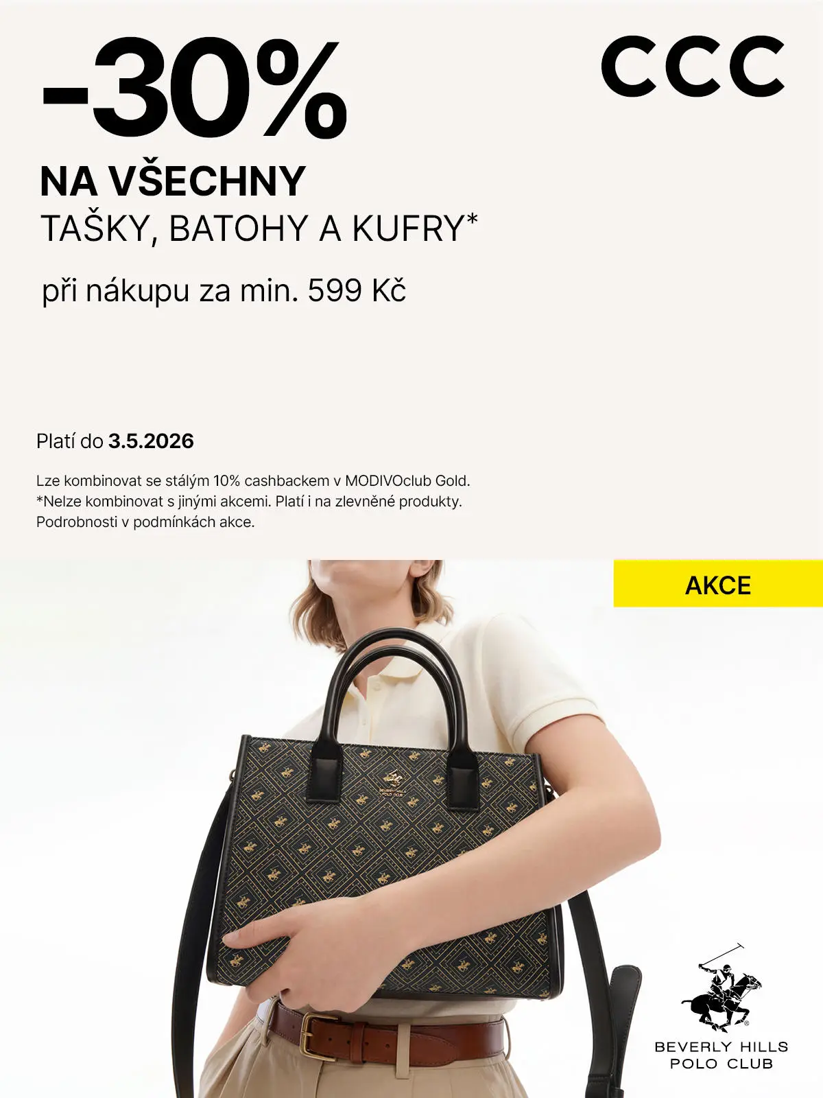 Vyberte si svůj nový kousek na cesty i do města se slevou 30 % při nákupu za min. 599 Kč. Stylové tašky, praktické batohy i prostorné kufry teď pořídíte ještě výhodněji. Akce platí i na zlevněné produkty do 3. 5. 2026 v prodejnách CCC.