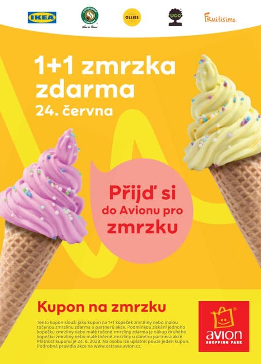 3.1. Účastník akce má po předložení kuponu „1+1 zmrzlina zdarma“ (dále jen „kupon“) nárok na 1 kopeček zmrzliny nebo malou točenou zmrzlinu zdarma (dále jen „dárek“) a to u zapojených prodejců zmrzliny Avion Shopping Parku Ostrava: Fruitisimo, Coffeeshop Company, Ollies, UGO, IKEA. Podmínkou však je nákup druhého kopečku zmrzliny, nebo malé točené zmrzliny u stejného prodejce, zapojeného do akce.